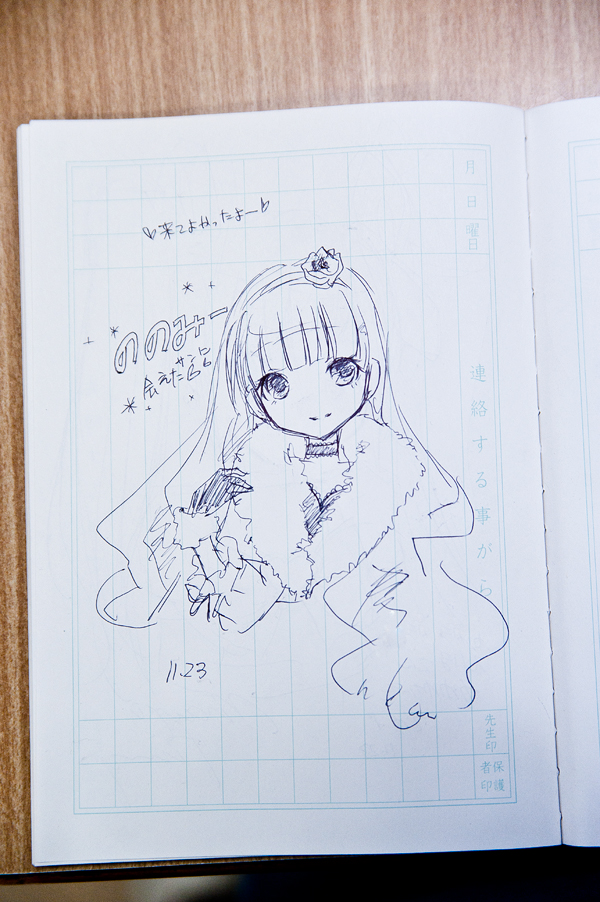 加えて、2年前に私がレイヤーになるきっかけを与えてくださった方からはお姫ちんのイラストもいただきました。私たちの喫茶にもゲームセンター等によくある自由帳的なサムシングが設置してあったので、そこにババーンと。